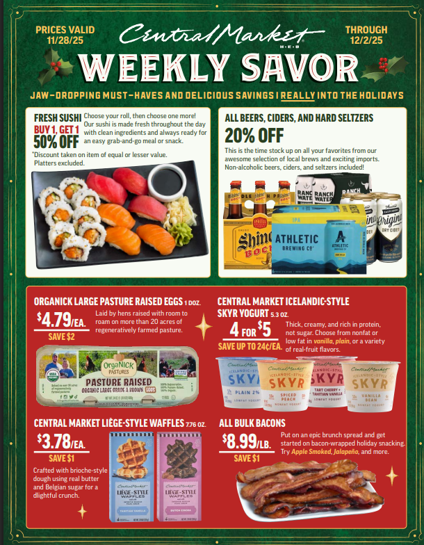 The Central Market Weekly Ad offers savings across a wide range of products. Find deals on fresh fruits and vegetables, quality meat and seafood, bakery treats, dairy, pantry staples, and organic items—making it simple to shop by category every week.